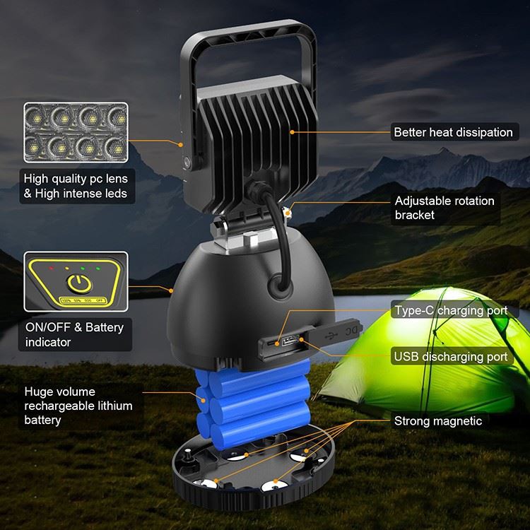 2. Imperméable : le Flood Light adopte une conception anti-chute et imperméable. Parfait pour la réparation automobile, le camping, la pêche, l'éclairage de secours...